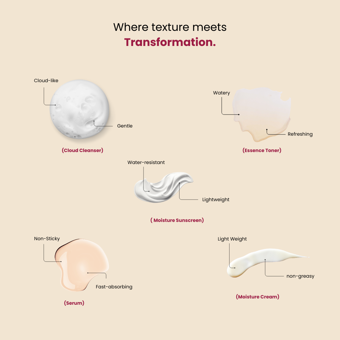 Size: Cloud Cleanser – 150ml | Essence Toner – 150ml | Serum – 30ml | Moisture Cream – 75ml | Niacin Ginseng Moisture Sunscreen SPF – 50ml